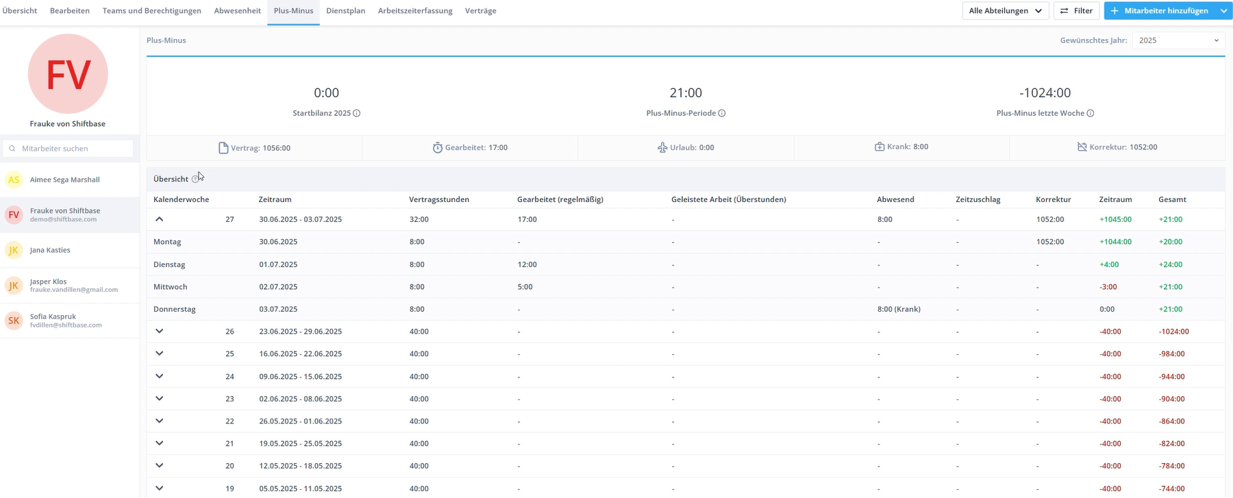 Um eine Übersicht über die Plus-Minus-Stunden pro Mitarbeiter zu erhalten: