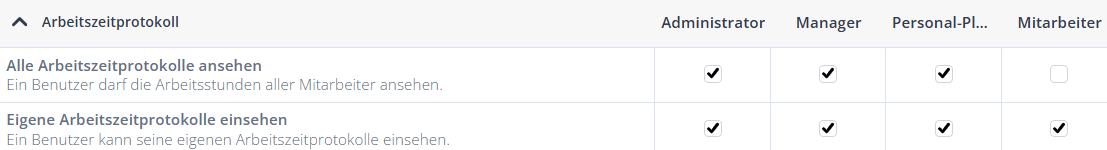 - Arbeitszeitprotokoll – Eigene Arbeitszeitprotokolle einsehen → Mit dieser Berechtigung kann die jeweilige Berechtigungsgruppe nur die eigenen geleisteten Arbeitsstunden einsehen.