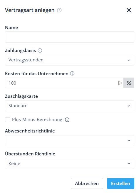 Diese Einstellung bestimmt, ob ein Mitarbeiter mit diesem Vertragstyp auf Basis der gearbeiteten Stunden oder der Vertragsstunden bezahlt wird. - Kosten für das Unternehmen