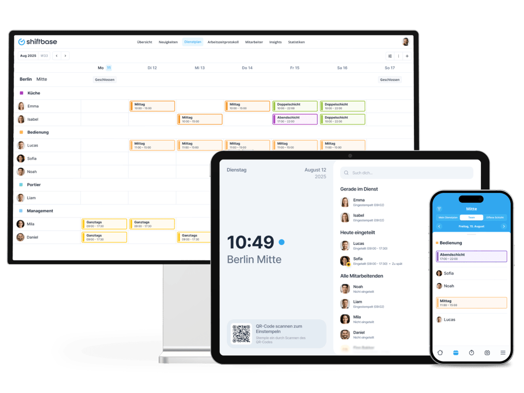 Mit Shiftbase lässt sich die Dienstplanung deutlich schneller erstellen. Verfügbarkeiten, Schichten und Regeln werden automatisch berücksichtigt, sodass du Dienstpläne ohne aufwendige Excel-Tabellen erstellen kannst.