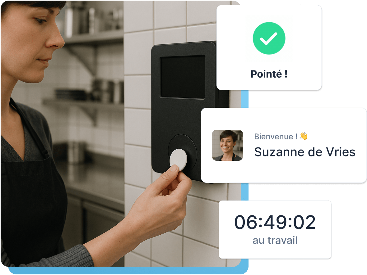 Enregistrez vos heures de pointage via horodateur, application kiosque, mobile ou caisse enregistreuse.