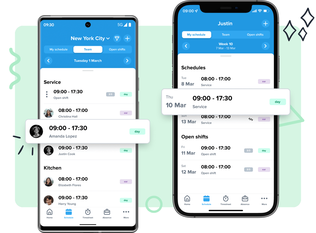 The mobile app (iOS & Android) brings nearly all Shiftbase features to your phone—from viewing and editing schedules, requesting time off, tracking hours, and clocking via geolocation, to managing notifications, open shifts, news, and plus/minus balances.